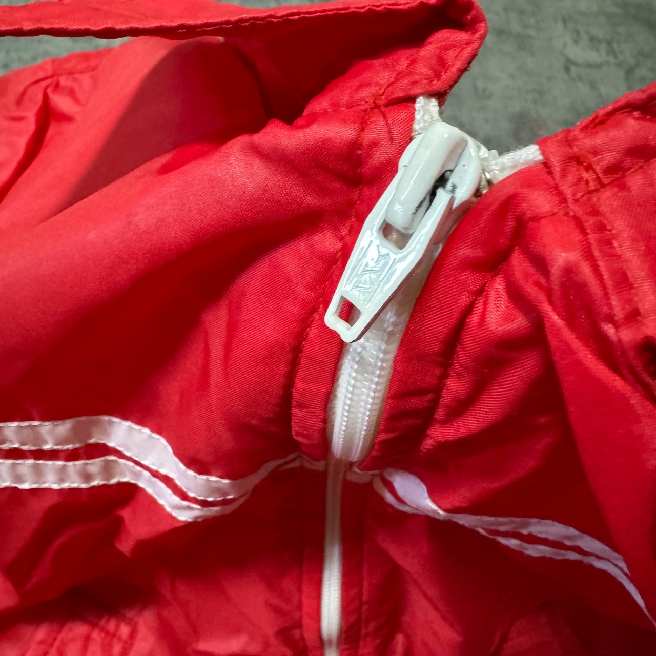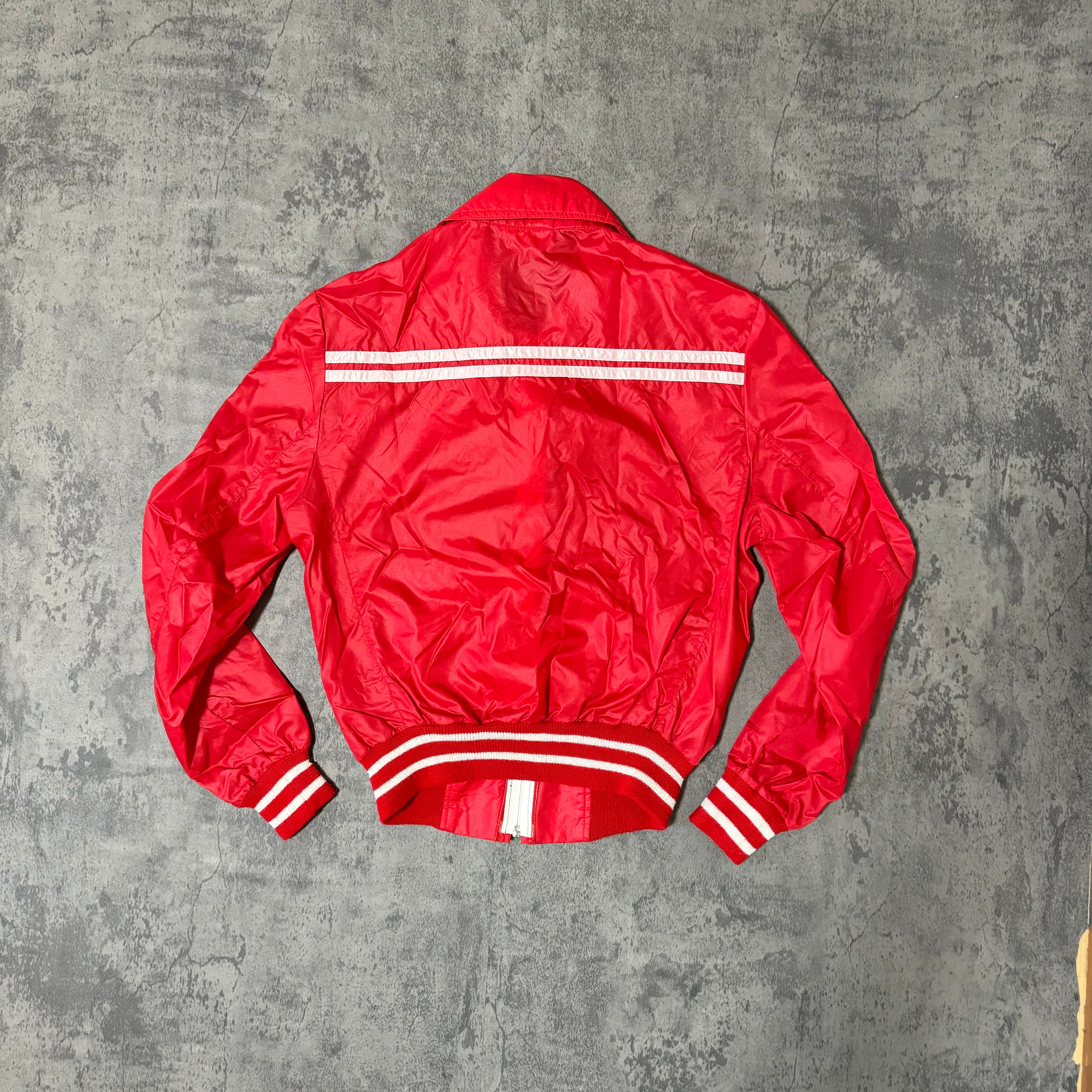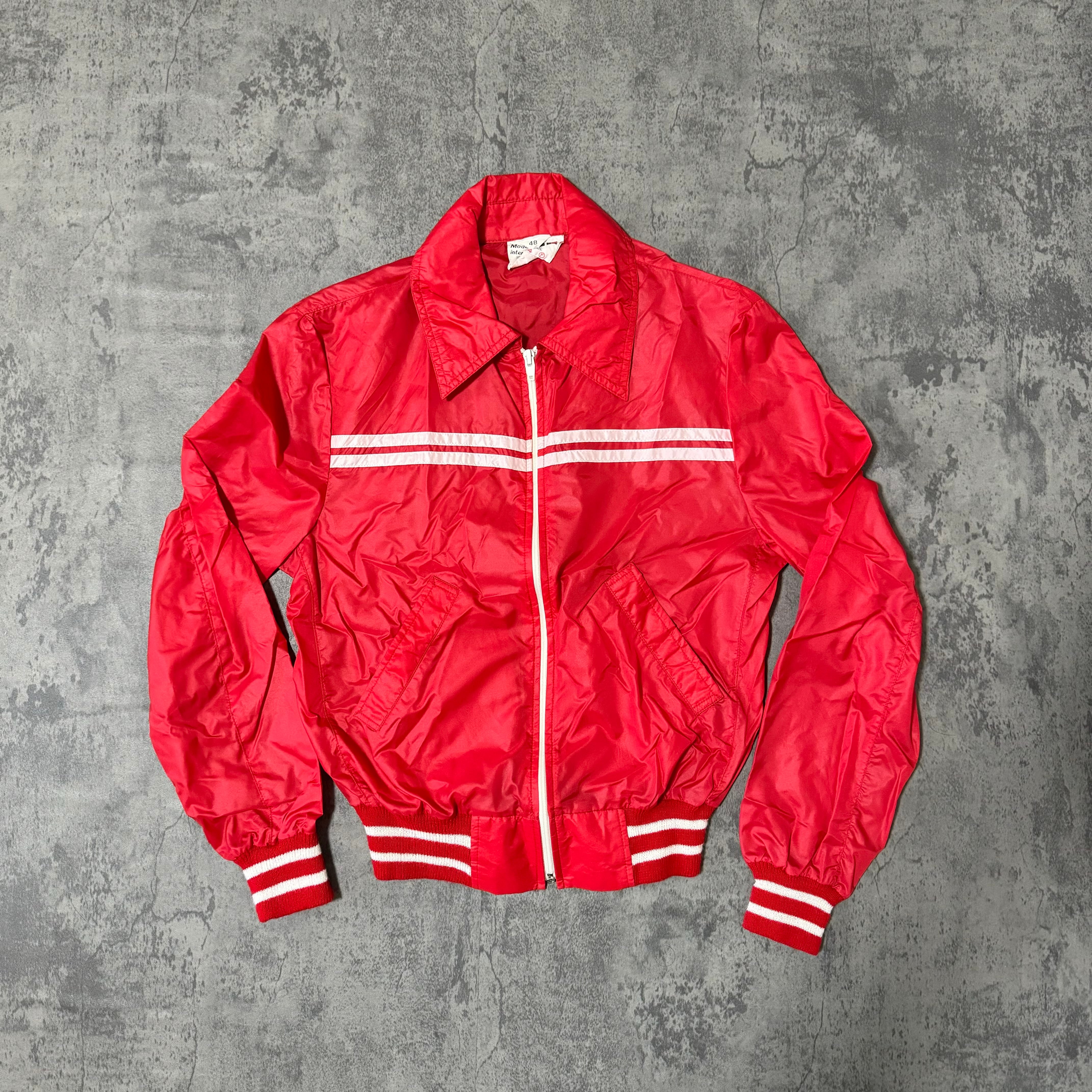 鮮やかなレッドにホワイトのストライプが映える、クラシックなデザインのナイロンジャケットです。80年代から90年代にかけてのスポーツウェア全盛期を彷彿とさせるシルエットと配色で、ヴィンテージスタイルにも取り入れやすい一品です。軽量で扱いやすいナイロン素材を使用しており、デイリーユースからアウトドアまで幅広いシーンで活躍します。