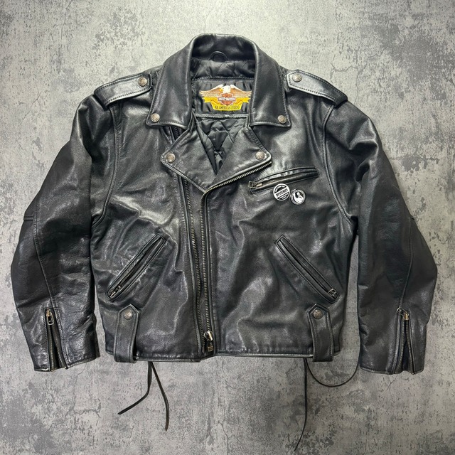 【Harley-Davidson ライダースジャケット】 Harley-Davidsonならではの威厳と存在感を宿したヴィンテージライダースジャケット フロントには重厚感あるデザインのジップスタイルを採用し、バックには大胆かつ立体的なブランドロゴのエンボス加工が施されています。サイドのレースアップディテールが独特のアクセントとなり、ライダーのこだわりを感じさせる一着です。 ※フロントジッパーに破損があり、前を閉じて着用するには修理、交換が必要となりますが開いた状態で着用する分には問題ございません。 【表記サイズ】 M 【実寸】 着丈54cm 肩幅51cm 身幅53cm 脇下袖丈42cm 【素材】本革 唯一無二のスタイルを求める方に。経年変化が楽しめる、上質な一着をぜひお手元に。